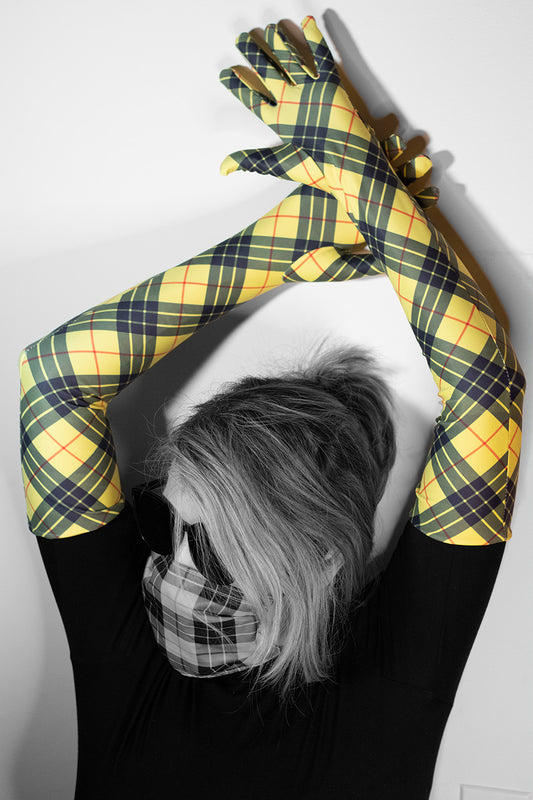 Bright yellow Dinosaur Tee - T-rex!! Fashionable Dino in teal Plaid Print