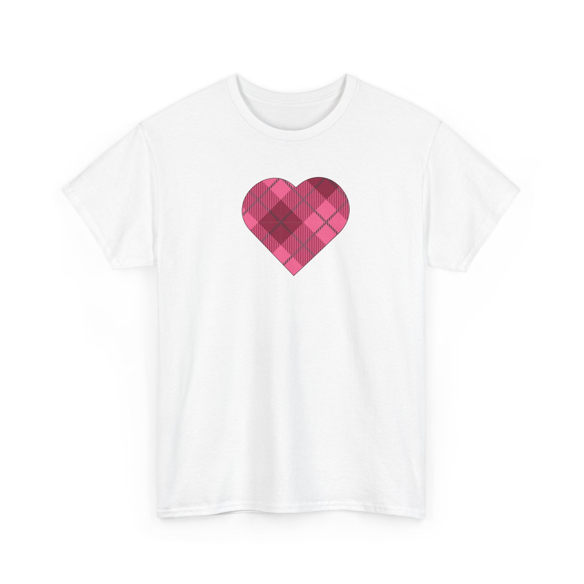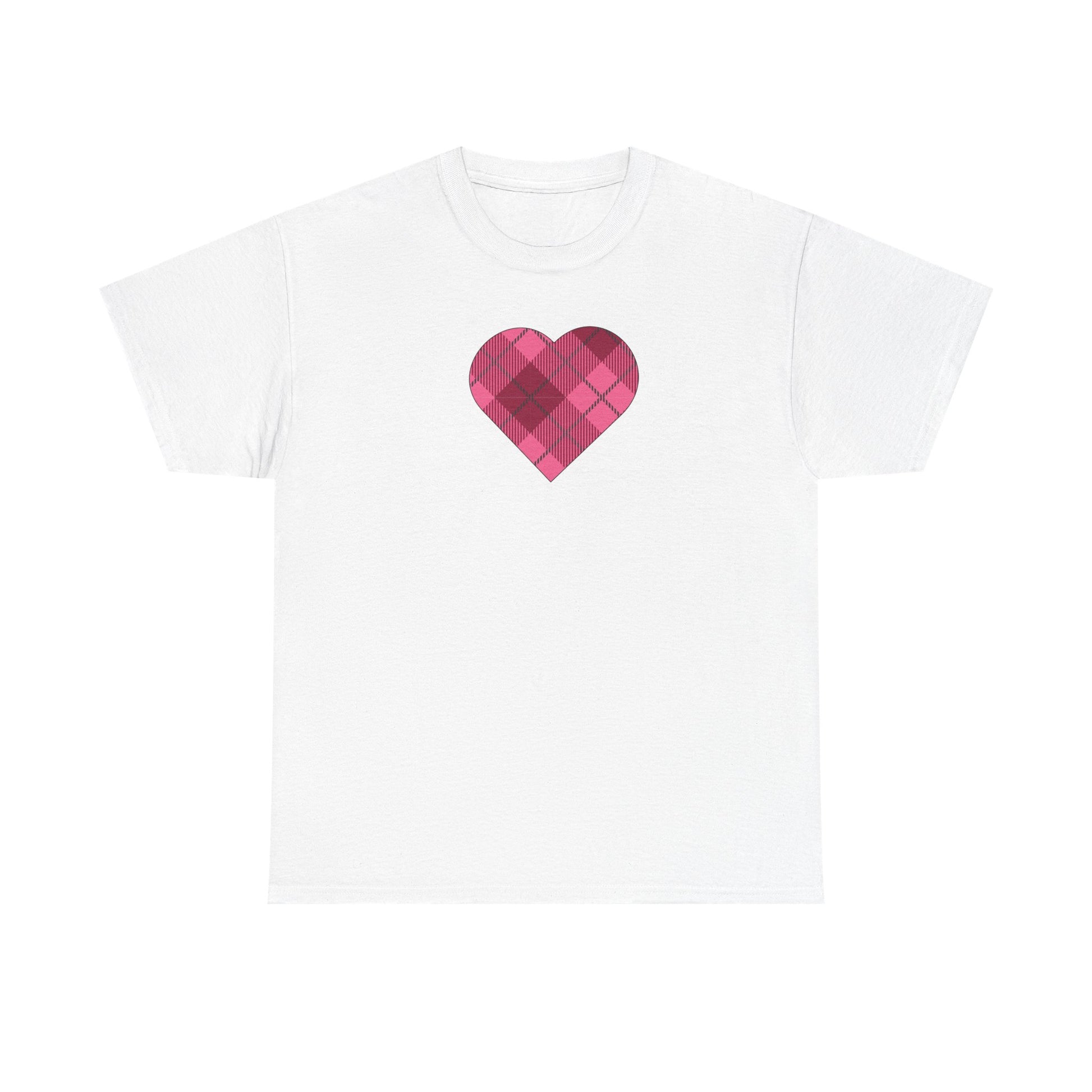 A classic unisex tee featuring a plaid heart design on a white shirt. This tee is perfect for everyday wear and adds a touch of fun to any outfit. Ideal for adults looking for a comfortable and durable piece for casual occasions.